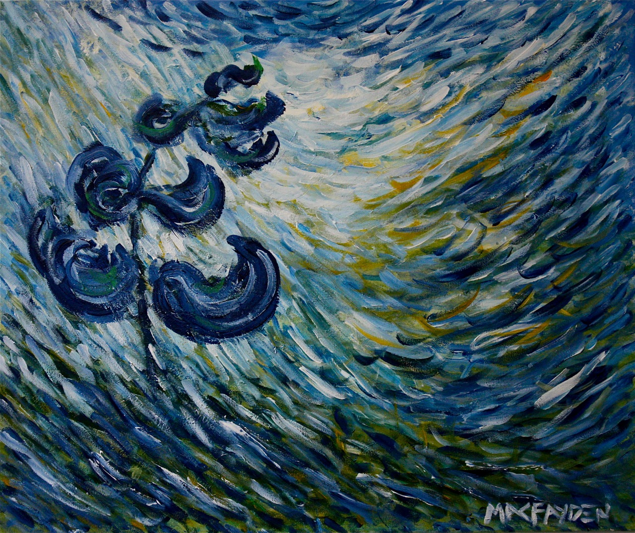 For me, art-making is not merely a process of visual expression but a merging with the divine spark/vibrational energy that is, to me, the creative process. The resulting work is hard to categorize: I paint serene, post-impressionist landscapes and I paint boisterous, abstract-expressionist colour bombs. I paint electric skies and lively, dancing gardens. My urban and inner landscapes are more visceral; I apply paint with a vengeance, using brushes, knives, electric toothbrush, rolling pin … dabbling, flinging, dripping.